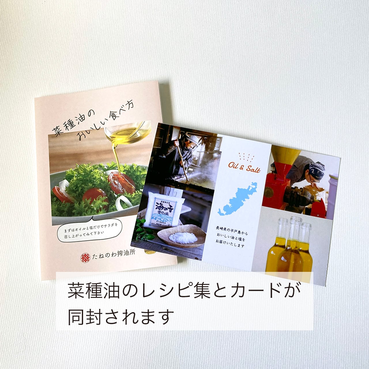 搾油所のある平戸島で作られている、私たちおすすめの海水塩を油とセットにし、さらにお料理が楽しくなるギフトをご用意しました。
